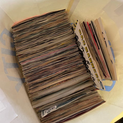 En ica kasse plus lite till med skivor. En hel del reggae och annat men mest reggae bob marley. Man tar det som det är för detta priser. Och inte inspektera alla skivor. Kan fattas någon eller ligga fel sorterat men mycket bob marley skivor. En del skadade fodral och ja allmänt så. Men för detta pris gör det inget. 200kr hämtas på plats prutas ej
