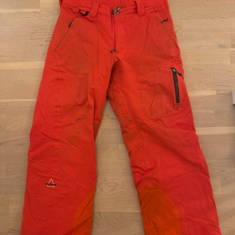 Helly Hansen skidbyxor i orange färg, herrmodell i storlek M. Byxorna är tillverkade i syntetmaterial med förstärkningar nedtill på benen.