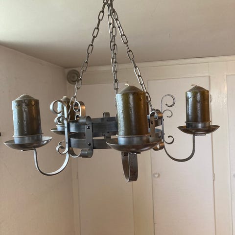 Fin 5-armad ljuskrona i smide att hänga i exempelvis tak. Lämpar sig bäst för blockljus eller värmeljus.
