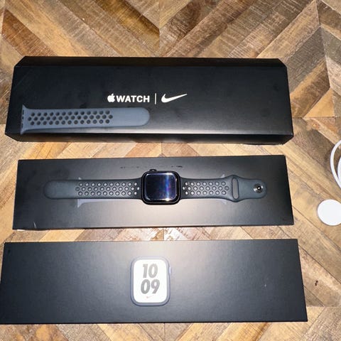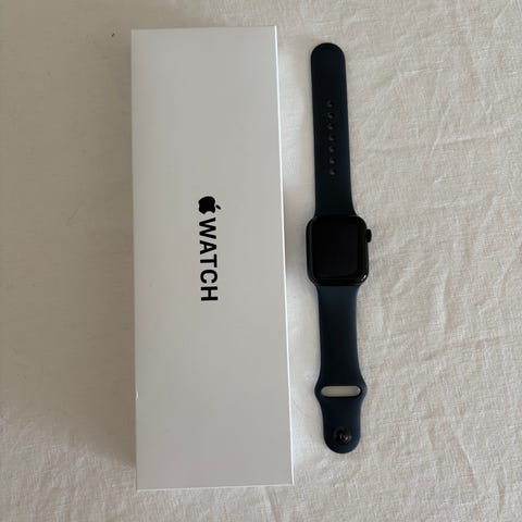 Apple Watch smartklocka i svart med medföljande magnetisk laddkabel. Klockan har rektangulär pekskärm och svart armband i syntetmaterial. Levereras i originalförpackning med insats för klocka och armband.