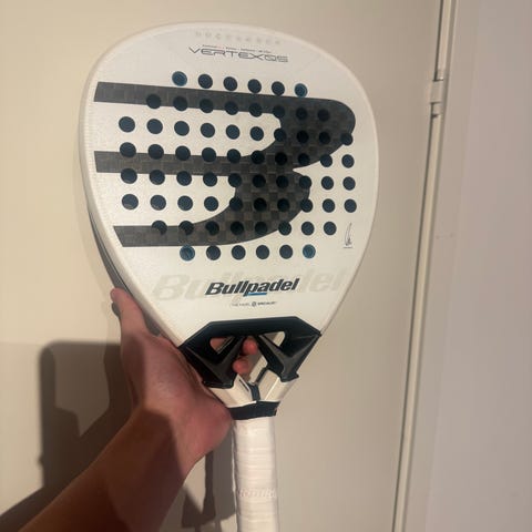 Bullpadel BP10 Evo padelracket i svart/grå färg. Racketet har perforerad träffyta med rund form och balans anpassad för kontrollspel. Modellbeteckningen BP10 Evo framgår på ramen. Greppet är lindat med originalgrepp och handledsrem finns monterad. Passar för padelspelare som söker ett kontrollinriktat racket för spel på padelbana inomhus eller utomhus.
