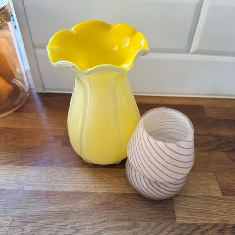 Fyra vaser i blandade modeller och material. En genomskinlig glasvas, två mindre keramikvaser i vitt respektive rosa samt en hög glasvas i ljusblått och klart glas. Passar för snittblommor eller som dekoration i hemmet. Märke och modell är okända.