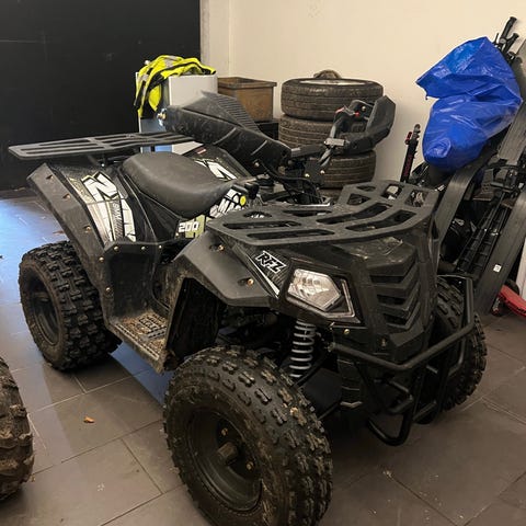 RZZ fyrhjuling i orange och svart färgsättning. Modellen har grovmönstrade däck, dubbla stötdämpare fram och fotsteg med skyddsgaller. Utrustad med styre med handskydd och nödstoppslina. Passar för körning på varierat underlag som grus och lättare terräng. Drivmedel, motorstorlek och övriga tekniska specifikationer framgår inte av bilderna och bör kontrolleras med säljaren.
