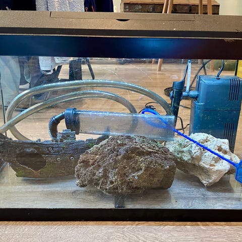 Aquael akvarium med lock, inbyggd belysning och internfilter. Akvariet är rektangulärt med glasrutor och plastlock. I akvariet finns ett Aquael-filter med sugkoppar för montering på glaset samt en doppvärmare. Locket har integrerad belysning med strömbrytare och öppningslucka för utfodring. Passar för sötvattensfiskar eller andra vattenlevande djur beroende på volym och utrustning som kompletteras.