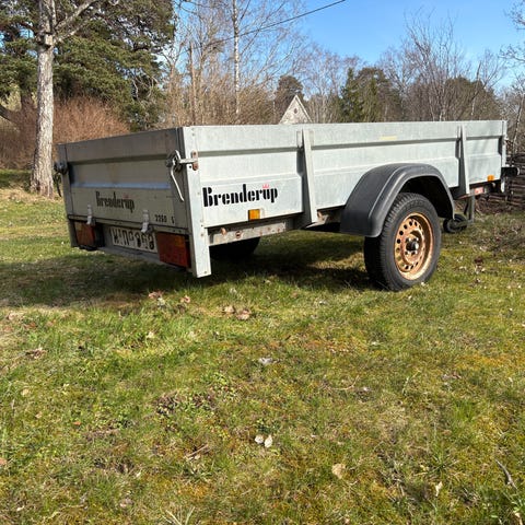 Släpvagn med trädäck och metallchassi. Utrustad med dragkrokfäste fram och bakljus med reflexer. Flaket består av träplankor och har stolpar/skenor längs sidorna.
