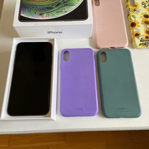 Apple iPhone X mobiltelefon med 64 GB lagringsutrymme. Enheten har pekskärm och kör iOS. Passar för vardaglig användning som samtal, meddelanden, surf, appar och media. Bilderna visar telefonens skick samt baksida med skal och dekorationer.