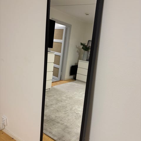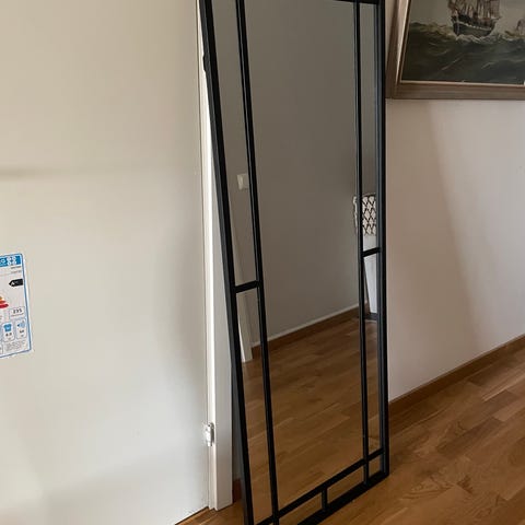 Spegeln kan antingen hängas upp vertikalt på väggen (fästen finns på baksidan) eller användas som en "leaner mirror" lutad mot väggen.
