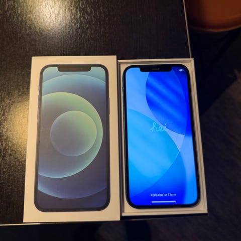 Apple iPhone 12 mobiltelefon med 64 GB internminne. Modellen har dubbla bakre kameror, framåtvänd kamera och pekskärm. Färgen är svart. Enheten på bilderna visar platt kantdesign och levereras med originalkartong och laddkabel enligt bild, om inget annat anges av säljaren. Lämplig för användning med appar, surf, meddelanden, samtal och fotografering. Fint skick, inga repor