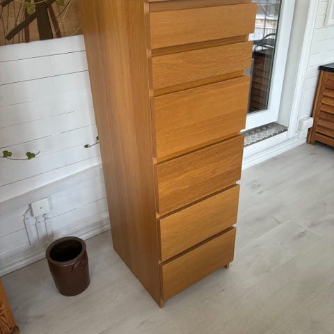 Säljer två stycken IKEA MALM byråer med 4 lådor i ekfanér. Byråerna är rymliga och fullt fungerande i lådorna, men säljs billigt som ett paket på grund av några skavanker (se bilder).