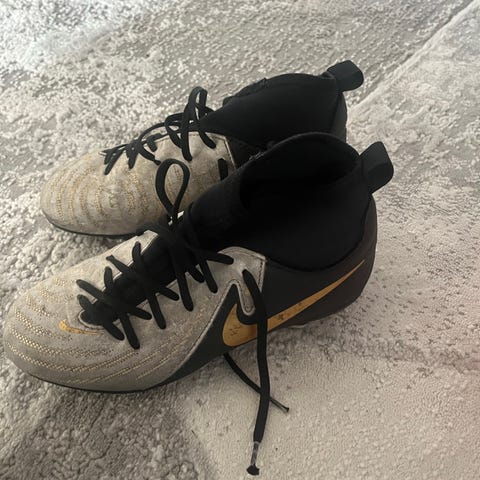 Puma fotbollsskor för inomhusbruk. Skorna har ovandel i syntetmaterial i vitt och svart med snörning framtill och strumpliknande skaft. Yttersulan är i rött gummi med mönster anpassat för inomhusplaner. Passar för användning vid futsal eller annan inomhusfotboll.
