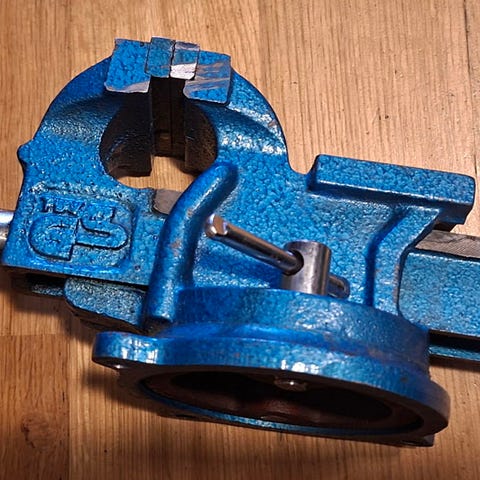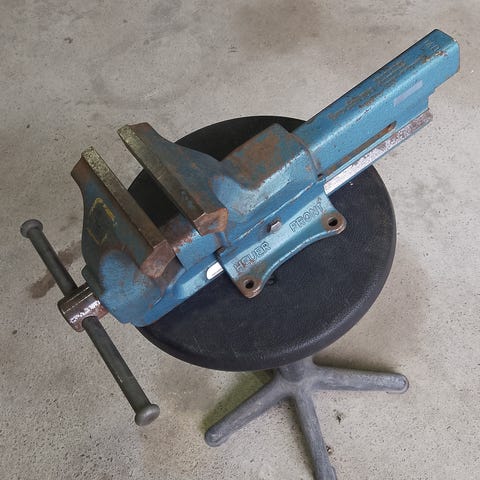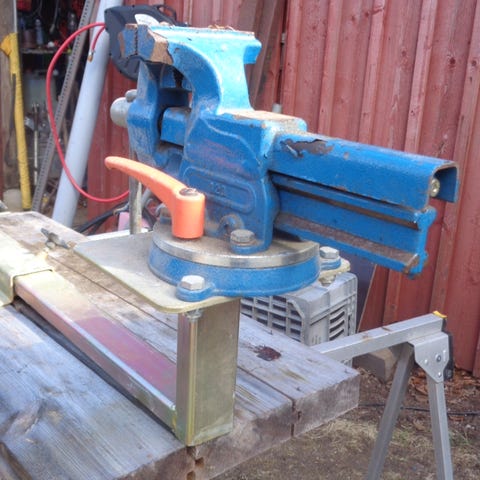 Skruvstycke i bänkmodell med käftar på cirka 135 mm. Märke Matador.