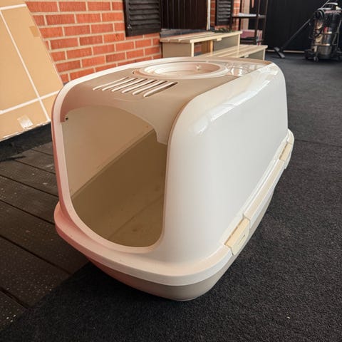 Kattlåda med huv i plast med frontlucka och ventilationsöppningar upptill. Avtagbart lock som fästs med spännen runtom samt bärhandtag på ovansidan. Medföljande sandspade syns i lådan.