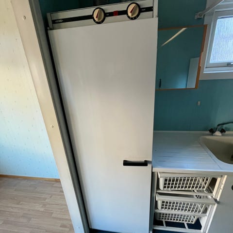 Electrolux RM 400 C kylskåp med front i metall. Kylskåpet har ett övre fack med frysfack samt två gallerhyllor i huvudutrymmet. I dörren finns flera hyllor för förvaring av flaskor och mindre förpackningar. Modellen är avsedd för drift på 230 V, 12 V och gasol enligt märkplåten, vilket gör den lämplig för exempelvis husvagn, husbil eller fritidsstuga där olika strömkällor används. Mått och exakta volymuppgifter framgår av märkplåten på insidan av skåpet.
