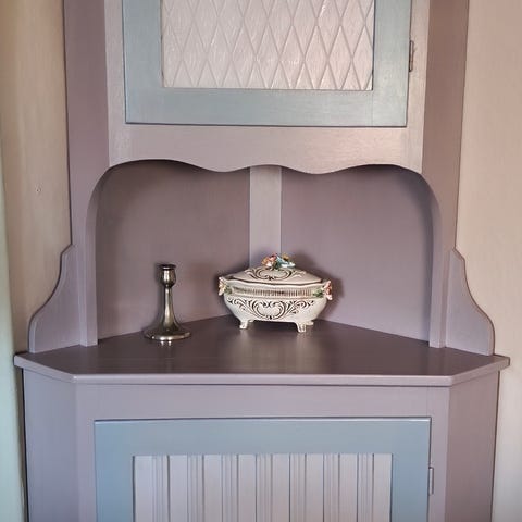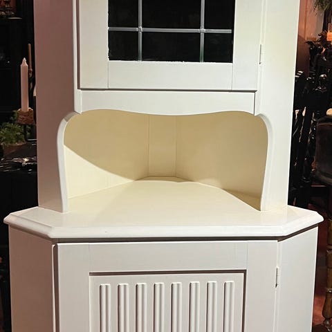 Hörnhylla i massiv furu. Hand gjord. Glas i lucka saknas. Ca 200 cm x 50 cm.