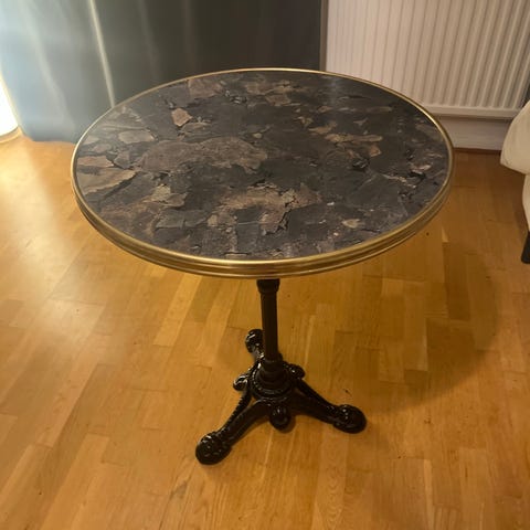 Runt sidobord i mörkbrunt trä. Bordet står på en dekorativ, svarvad mittpelare med fyra ben och har utsmyckade detaljer på underredet. Passar som litet avlastningsbord eller lampbord i vardagsrum, hall eller sovrum.