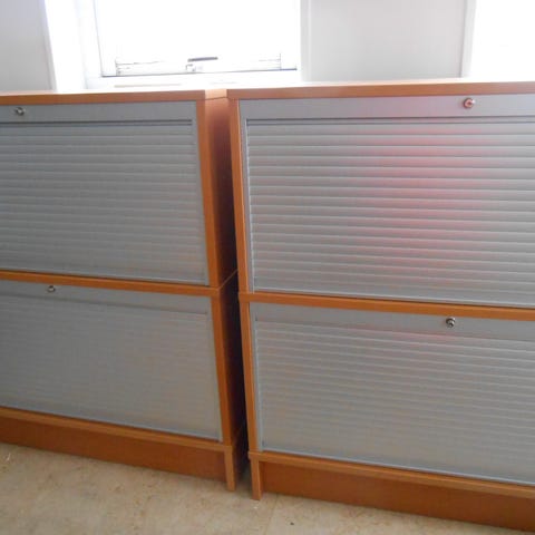 Fina skåp med rundade hörn på bokskivorna, i använt skick men välfungerande och stabila. Kan ställas ovanpå varandra och blir då 140 cm hög.