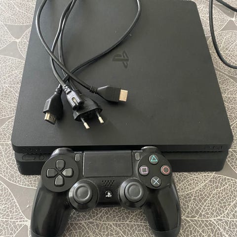 Konsolen är avsedd för spel, film och annan underhållning. På bilderna syns strömkabel, HDMI-kabel och en trådlös handkontroll. Det följer även med flera PS4-spel enligt bilderna, bland annat sport- och actiontitlar.