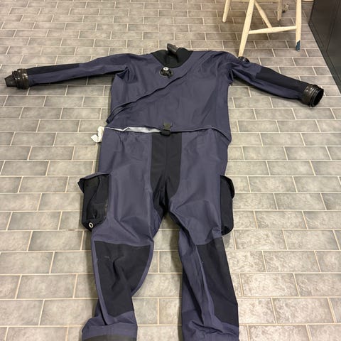 Bare torrdräkt i svart färg. Dräkten har dragkedja bak och ventiler på bröstet. Hals- och handledstätningar är i gummi/latex och behöver bytas. Integrerade stövlar med mönstrad sula. Torrdräkten är avsedd för dykning. Passar mej (178 skostorlek 40). M -L klädstorlek.