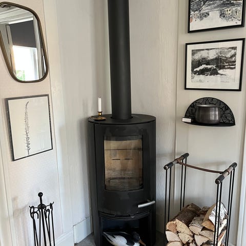 Eldstädsset i svart metall. Setet består av ställning med plats för verktyg och en nedre och övre hylla. Innehåller flera eldstadsverktyg som exempelvis skyffel och borste för hantering och skötsel av eldstad eller kamin. Passar för användning vid öppen spis eller kamin inomhus.
