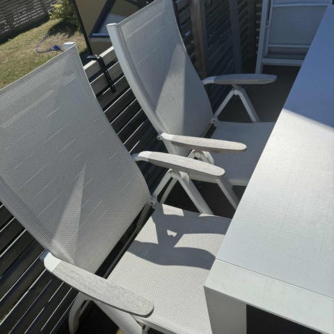Matgrupp för utomhusbruk bestående av rektangulärt bord med glasskiva och flera stolar i grå konstrotting. Bordet har ben och sarg i samma flätade konstrotting som stolarna. Stolarna har hög rygg och armstöd med genomgående flätmönster. Passar för placering på altan, uteplats eller trädgård som sittgrupp för flera personer. Ena stolen är sönder se bild. Glas skivan har några repor, det är inte helt nytt. Har stått inomhus men säljes nu för ny köp. Mått bredd 1 m, längd 1,79m och höjden med glasskivan 74,5 cm