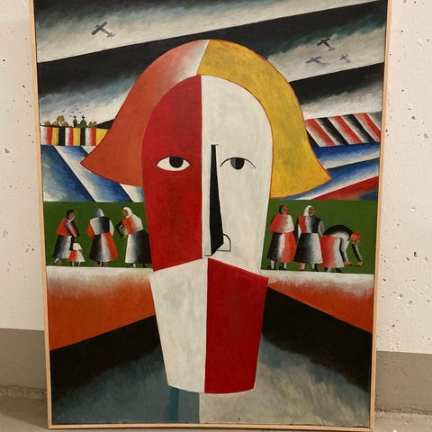 Tavla med abstrakt figur i geometriska former mot färgstark bakgrund. Olja på duk 81x62 cm. Kazimir Malevich(efter )Motivet visar en stiliserad person i centrum med omgivande fält i olika färger. Målningen är monterad i träram. Baksidan visar duk uppspänd på kilram. Passar som väggdekoration i vardagsrum, hall eller kontor.