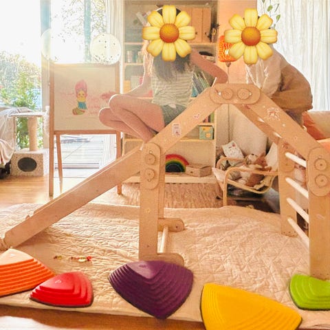 Superfin klätterställning i Montessori-stil. Här kan klättertokiga barn välja mellan tre olika varianter: rundstavar, rep eller klättervägg. Vi använde den när vår son var i den mest galna klätterperioden runt 1,5 år. Nu har det lugnat ner sig lite, så säljer den vidare till bättre behövande barn (och föräldrar!)