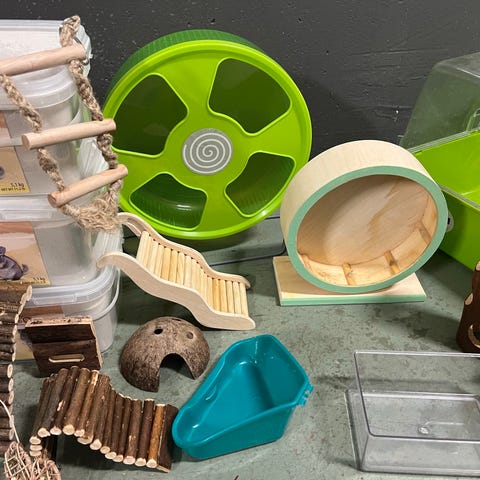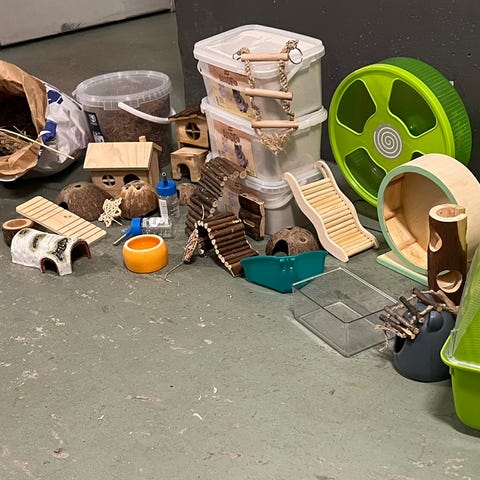Hamster. Hamstertillbehör; leksaker, matskål och vattenflaskor.