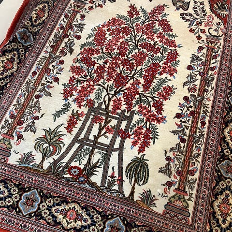 En otroligt vacker handknuten persisk matta med måtten 138x221 cm. Detta är en så kallad Ghom matta från staden Ghom i Iran. Mattorna från Ghom är kända för att göras med väldigt hög kvalité. Denna har väldigt små knutar och en fin knuttäthet. Köptes för ca 35-40 år sedan. Mattan är i väldigt gott skick för sin ålder. Tagits väl hand om. Naturligt bruksslitage men inga skador eller fläckar. Ett äkta hantverk som håller i flera generationer!