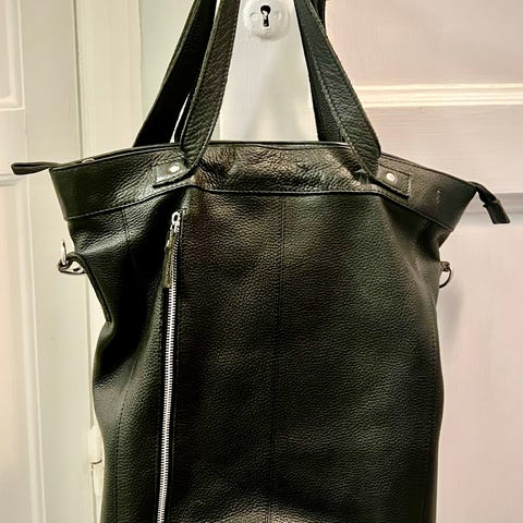 Wos axelväska i ljusblått konstläder. Väskan har en axelrem med metallkedja och läderdetaljer. På framsidan finns Wos-logga i metall. Väskan är rektangulär med mjuk, något rynkad front. Storleken framgår av bilderna med måttband och lämpar sig för vardagsbruk, med plats för mindre personliga tillhörigheter som plånbok, mobil och nycklar.