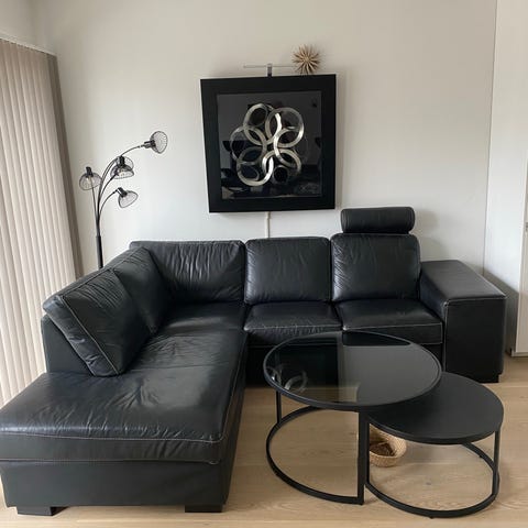 Säljer denna oerhört fina hörnsoffa i svart narvläder. Både stilrent och praktiskt med svart läder, enkel att torka av - och blir bara snyggare med tiden!