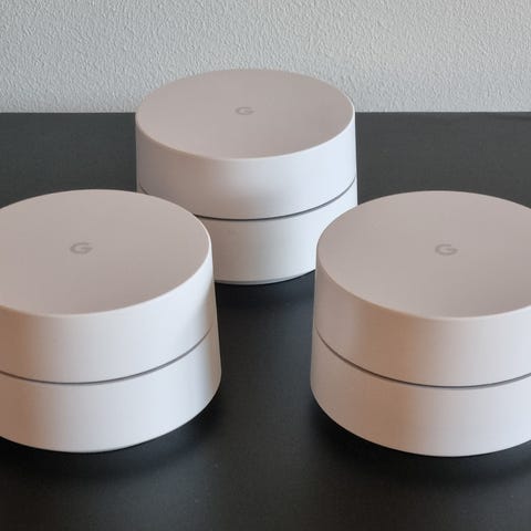 Google Wifi mesh-router i vit färg. Systemet består av flera runda enheter som tillsammans skapar ett trådlöst nätverk i hemmet. Varje enhet har nätverksportar och strömanslutning på undersidan. Medföljande nätadaptrar används för att ansluta enheterna till vägguttag. Routern är avsedd för användning som trådlöst nätverk i bostad eller mindre kontorsmiljö och kan placeras ut på olika platser för att ge täckning i flera rum.