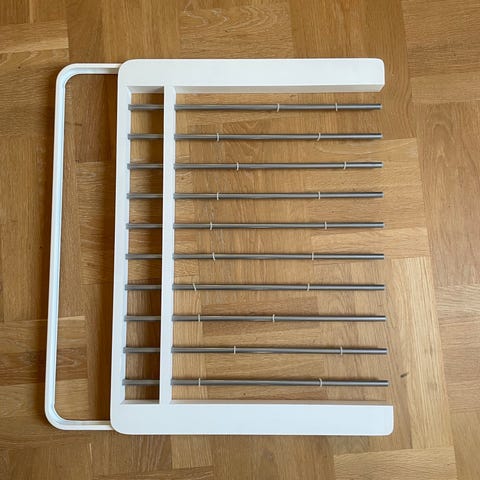 Elfa Classic byxhängare 60 i vit färg. Avsedd för montering i Elfa-system för förvaring av byxor på utdragbara stänger. Passar i garderob eller förvaringslösning där Elfa-skenor och konsoler används. Konstruktionen ger separata platser för flera byxor och underlättar översikt och organisering i garderoben.