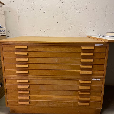 Söker fungerande ritningsskåp eller arkitektshurts med flera lådor på hjul i trä eller plåt, på rimligt avstånd från Skövde. Bild för uppmärksamhet