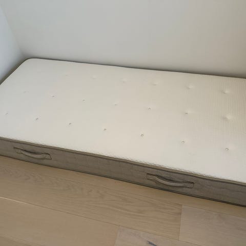 IKEA bäddmadrass i vit färg. Madrassen är avsedd att placeras ovanpå en säng eller resårbotten för ökad komfort. Ytan är quiltad med knappar och har en slät undersida. Passar som extra komfortlager i enkelsäng eller liknande sänglösning. Den har lite gula fläckar som ej går bort men med överdrag så syns det ej. Resårbotten tillhör med bäddmadrassen, de är 80 x 200 cm. Har även en tillhörande överdrag i vit färg. Mycket bra skick och mjuk. Pris kan diskuteras vid snabb affär