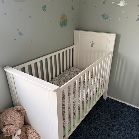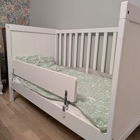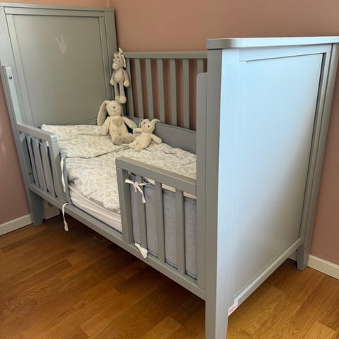 Troll royal spjälsäng + juniorlångsida I fint skick! Sängen är justerbar i tre olika höjder. Madrass av god kvalité från IKEA ingår om man vill. Finns även lakan och bäddset om så önskas. Vi har varit väldigt nöjda med sängen och har haft två likadana till våra barn.