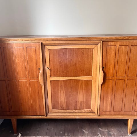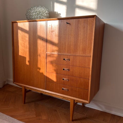 Säljer ett snyggt retro skåp i teak från mitten av 1900-talet. Skåpet står på sneda ben och har två dörrar med fina mässingshandtag. Inuti finns ett hyllplan som ger bra förvaring.