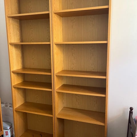 Två Billy bokhyllor i furu. Några av de flyttbara hyllplanen är delvis lite förändrade i färgen. Den ena hyllan har ett hål i ryggen på ca 4,5x5 cm, men hyllplan kan placeras så att hålet inte syns när man tittar på hyllan ståendes framifrån. 200 kr/st. Endast avhämtning på plats i södra Uppsala.