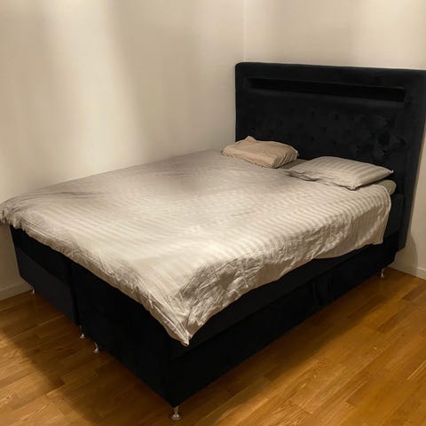 Mio säng med hög stoppad gavel i grått tyg. Sängen består av två underdelar med gemensam bäddmadrass ovanpå. Huvudgaveln är klädd och har knappstoppning. Passar som dubbelsäng i sovrum. Färg och utförande enligt bild.