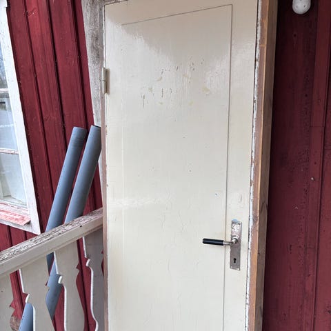 Innerdörr 1985x920 mm (verkliga mått på karmen) med gamla gångjärn inklusive lås och nyckel. Har suttit på övervåningen i många många år och har klarat sig utan större skador än ytliga. Slipa och måla sen är det klart.