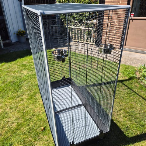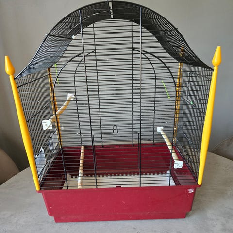 En stor och rymlig bur med gott om plats samt en fågelbo, gunga m.m. Finns på bilderna. Buren går att öppna på sidorna och på framsidan där det finns en liten samt en större dörr.