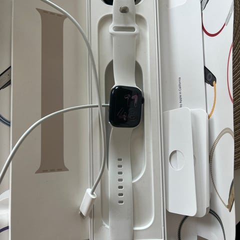 Apple Watch Series 7 smartklocka med 45 mm. Klockan har rektangulär skärm och levereras med matchande armband och magnetisk laddkabel enligt bild. Lämplig för användning med kompatibla Apple-enheter för notifieringar, aktivitetsmätning och andra smartklockfunktioner.