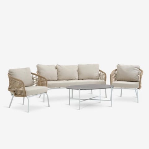 Utemöbelset bestående av en tvåsitssoffa, två fåtöljer och ett lågt bord. Möblerna är i svart metall med nätsits och ryggstöd. Bordet har en slät bordsskiva i svart som är vändbar. Säljs utan dynor inköpta förra våren