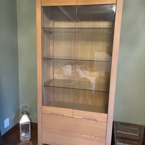 2 Vitrinskåp i ljust träimitation med skjutdörrar i glas och ett hyllplan (saknas i ett skåp). Skåpen har inbyggda upphängningskrokar för Elfa-konsoler (4st 20cm konsoler medföljer). Perfekt display för dina käraste ägodelar 😃