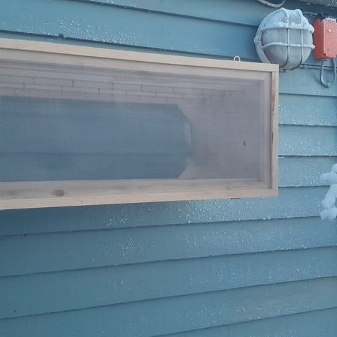 Längd 75cm höjd 30cm djup 38cm. Finmaskigt insektstät aluminiumnät. 29 öglor i ovandel med 29 rostfria s krokar att hänga i istället för snören. 4 större öglor ovanpå för att hänga på väggen eller under takfoten.