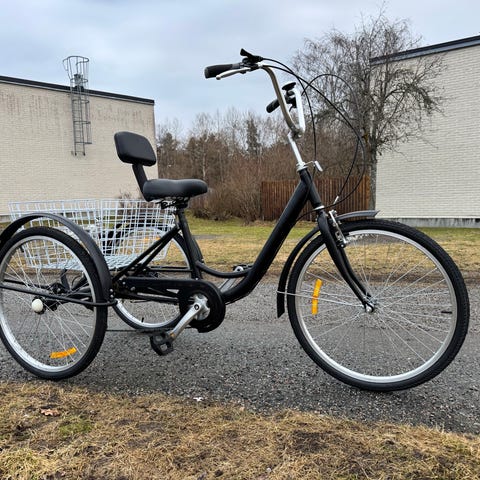 Sparsamt använd trehjuling med lastkorg och lågt insteg för lätt av- och påstigning.