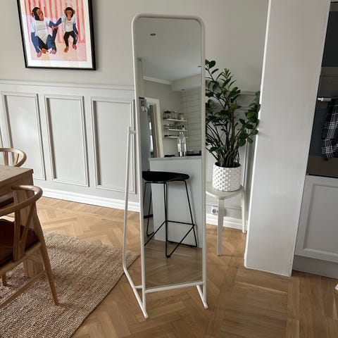IKEA spegel i helkroppsmodell med vit metallram och fristående stativ. Spegeln är rektangulär och står på golvet, vilket gör den lämplig för sovrum, hall eller klädkammare. Metallramen ger en stabil konstruktion och den smala formen gör att den tar liten golvyta.