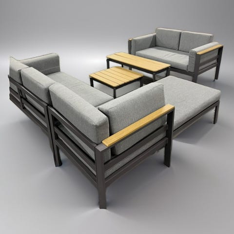 Stommen är i metall med raka, svarta ben och armstöd. Sits- och ryggdynor är tjocka och klädda i grått tyg. Gruppen är avsedd för altan, uteplats eller trädgård och ger sittplatser för 4-5 personer.