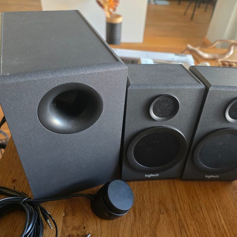 Logitech Z906 surroundljud högtalarpaket i svart utförande. Systemet består av en aktiv subwoofer, flera satellithögtalare samt kontrollenhet. Avsett för hemmabio, tv, dator eller spelkonsol där flerkanaligt ljud önskas. Ingångar och anslutningar framgår av kontrollenheten och baksidan på subwoofern. Strömförsörjning enligt märkning på baksidan. Passar för användning i vardagsrum eller kontorsmiljö där man vill ha surroundljud.