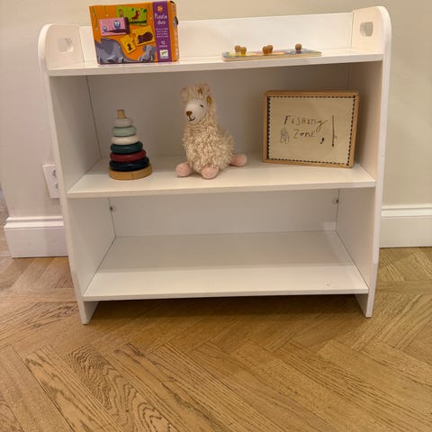 Säljer en fin dockhus-formad bokhylla / leksakshylla i vitt trä.