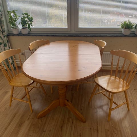 Stort köksbord massivt trä 155 x 103 cm med förlängnings skiva 48 cm. 6 stolar där dynan skulle behöva en rengöring eller bytas ut. Säljes endast som paket. Tungt och bärhjälp behövs.